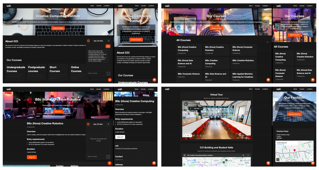 This week, I wrapped up the project website, which was built using React.js. The site is designed to be clean, responsive, and easy to navigate, with four main sections: a landing page, a course directory, individual course pages, and a location page that includes both an interactive map and a virtual tour. The layout is inspired by UAL’s existing design system to keep things familiar for users—especially prospective students.